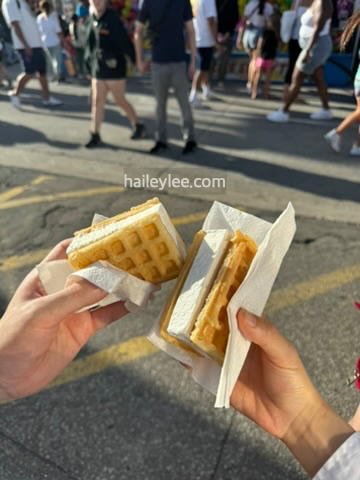 놀이기구가 모여있던 곳의 입구에 위치한 "아이스크림 와플"가게는 신선한 우유로 만든 아이스크림을 바로 구운 따끈한 와플에 끼워 팔아요. 가격도 약 5불로, 다른 가게에 비하면 엄-청 저렴하죠. 근데 너~무 맛있는거 있죠ㅠ 너무 달지도 않은 단백한 순정 그자체의 맛이였어요.